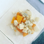 Cut the sheets of pastry into 12 squares (six squares per sheet). When the butternut squash and onion are cooked and cooled, add a desert spoonful to the middle of each square. Be careful not to overstuff as this can cause the pastry to tear. Add the Stilton, having chopped