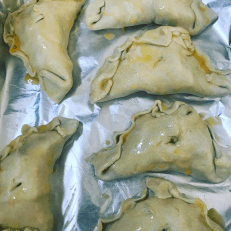 To seal the pasties dip your finger in water and run it around the edge of the pastry square. Fold the square over the filling and fold up the edges, crimping together (you can use your fingers, and don’t worry if it doesn’t look perfect, it will taste great and that’s all that matters!). Place on a baking tray and prick each pasty with a sharp knife before coating the pasties with the egg wash. Then pop them in the oven on gas mark 5 for 15-20 minutes or until golden brown.