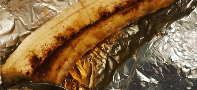 Open slightly and sprinkle a pinch of ginger, two pinches of cinnamon and drizzle with some honey or sprinkle with brown sugar, depending on how naughty you are being. Close the banana and wrap tightly in the tin foil, making a little parcel for the oven. Place on a baking tray and put in the oven (I put it on gas mark 5) for 20 minutes. Be careful when you take the parcels out of the oven and unwrap them as they’ll be very hot and possibly steamy. The good news is that these baked bananas are tasty enough to enjoy on their own – and they taste like such a treat!