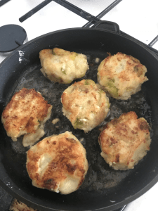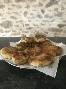 Brown the onions in a frying pan, using a small piece of butter. Half the already cooked sprouts and add to the pan, stirring together. Add to the mashed potato, adding the egg, a splash of milk, the garlic and salt and pepper, and mix together. Make sure you already have the flour set aside on a plate, as the next step will see you get very sticky hands! Take a ball of the mixture and flatten it to create a patty, then cover in flour on both sides and set aside. Once you have used all the mixture fry the patties in a pan of hot butter until golden brown. I especially like these farçou fresh from the pan with a soft boiled or poached egg. Delicious!