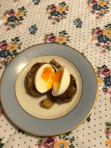Now split your sausage meat into three pieces. Roll out one piece of sausage meat between two pieces of baking paper (or using the paper the meat came in, if you’ve bought it from your local butcher). Wrap the disc of sausage meat around one egg, ensuring it’s covered fully. Then wrap in three pieces of streaky bacon, covering a different side each time. Secure with a cocktail stick or two. Once you’ve done all three eggs fry them in a pan of hot butter or oil, turning frequently until all sides are cooked.